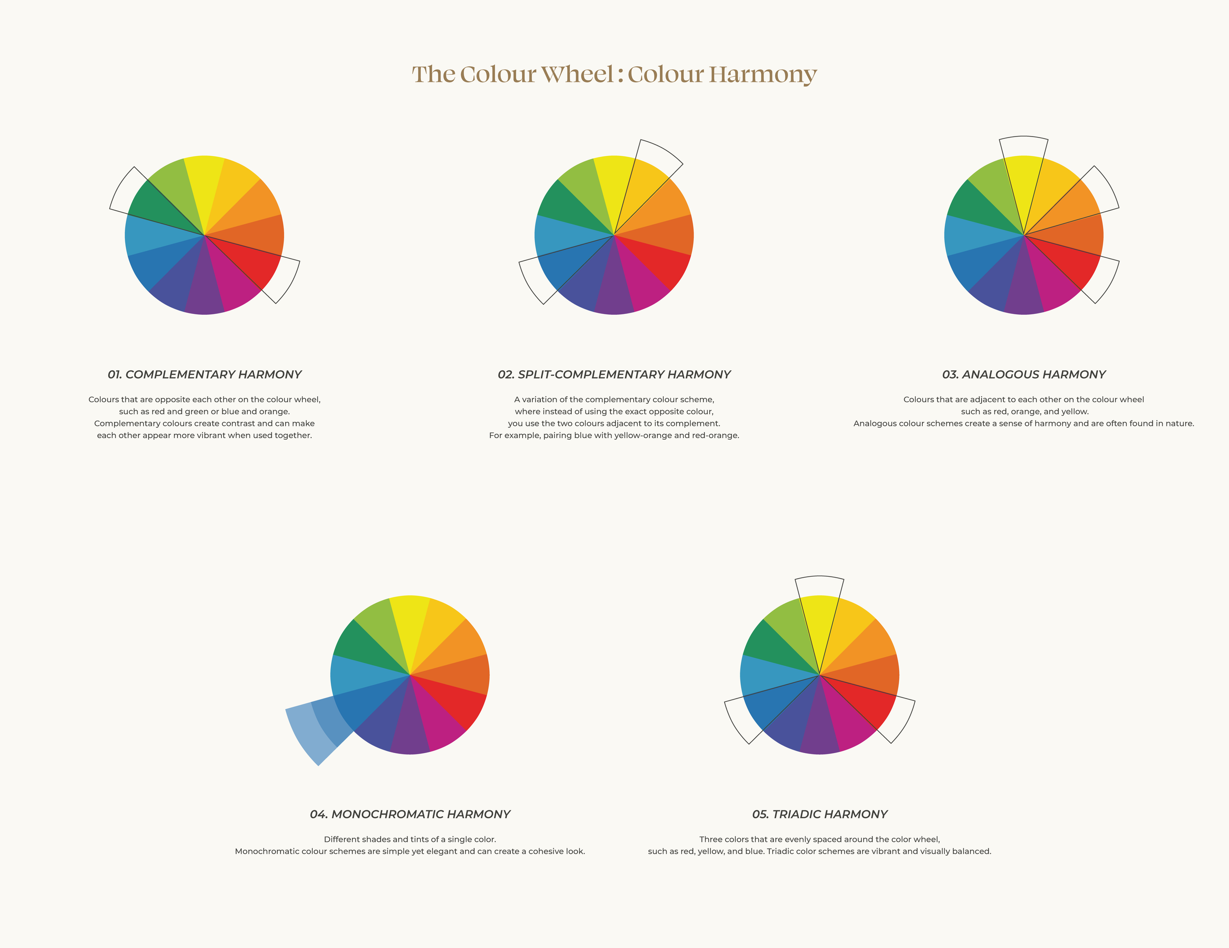 Colour harmony refers to the pleasing arrangement of colours in a design. There are five main colour schemes that designers use to achieve harmony: Complementary, Split-Complementary, Analogous, Monochromatic, Triadic.