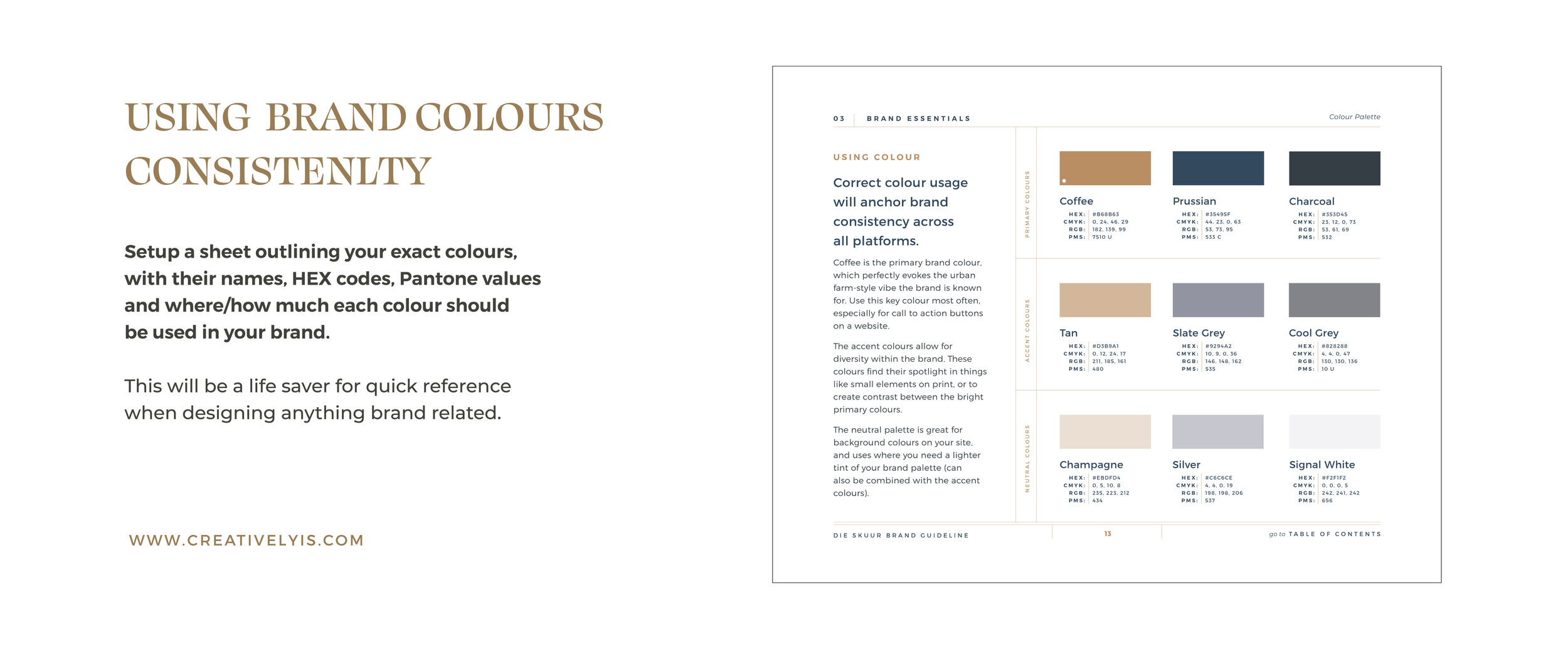 It’s easy to just grab a few colours from a few sources and call it a day. But being exact in the colours you choose will help you be consistent when applying these to your branded material. Setup a sheet outlining your exact colours, with their names, HEX codes, Pantone values and where/how much each colour should be used in your brand. This will be a life saver for quick reference when designing anything brand related.